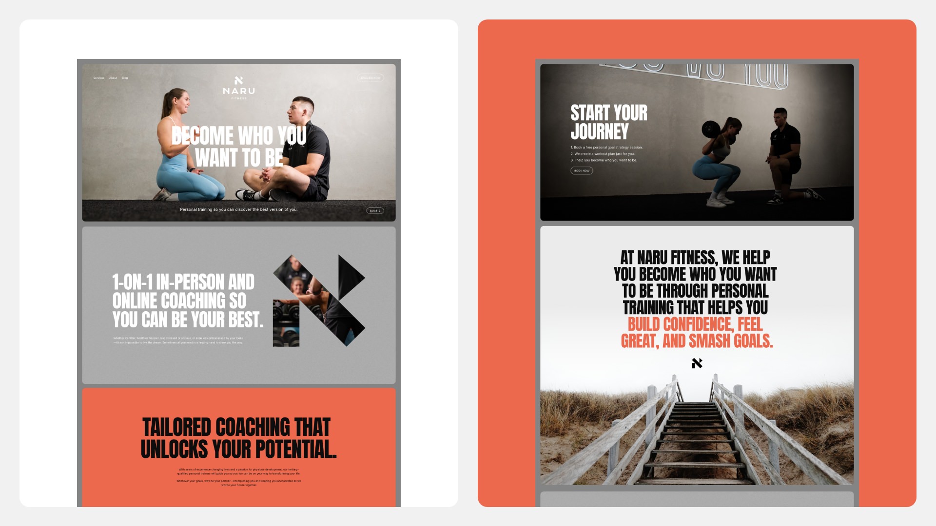 We relished the opportunity to collaborate with an energetic new business that recognised the value in having a clear brand and website direction. We started with a messaging workshop that helped us develop potential business names including ‘Naru Fitness’, as well as key marketing messages—these then informed the creation of the brand’s logo and visual identity.